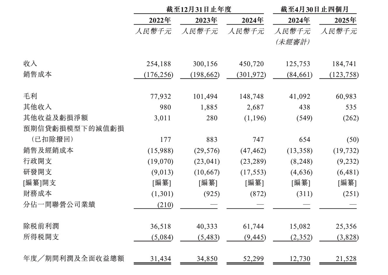招股书数据显示,大行科工2024年公司实现营业收入4.51亿元人民币,较2022年的2.54亿元累计增长77.56%,年复合增长率超过30%;同期归母净利润从0.31亿元增长至0.52亿元,增幅达67.74%。