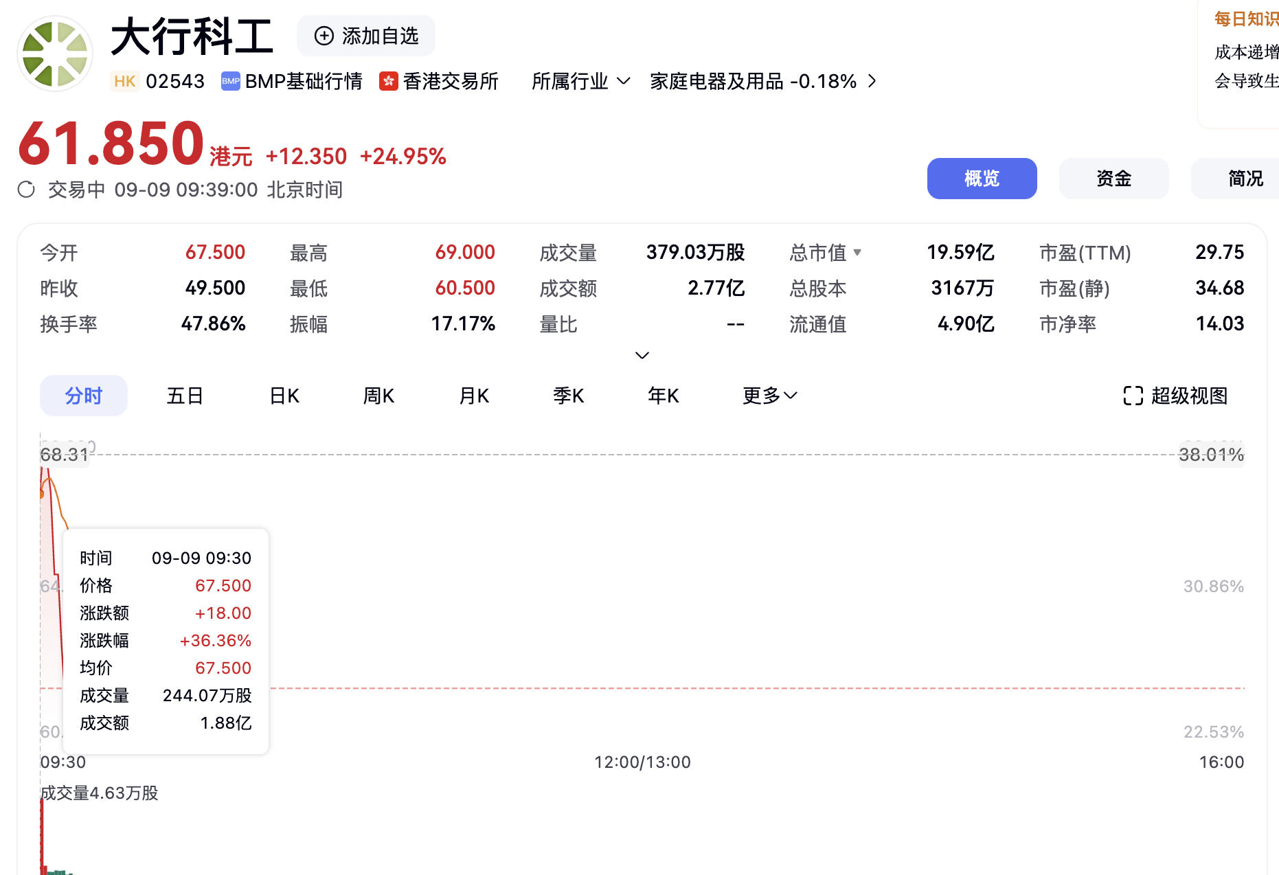 9月9日,被称为 “内地折叠自行车第一股” 的大行科工(02543.HK)在香港联交所主板正式挂牌交易,开盘报67.5港元,较49.5港元的发行价大幅高开36.36%,以每手100股计算,不计手续费每手可获利1800港元。